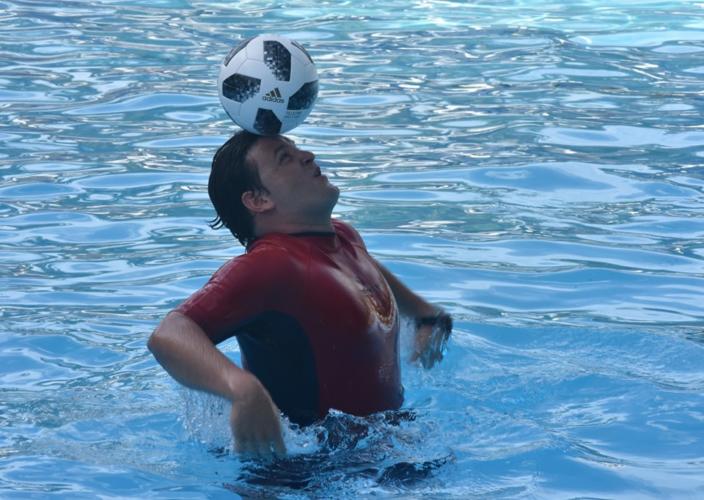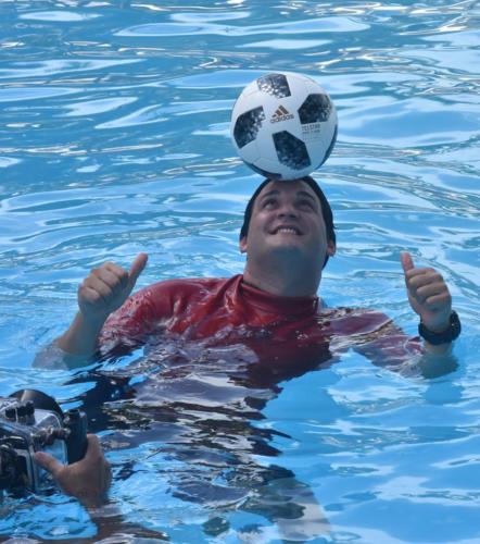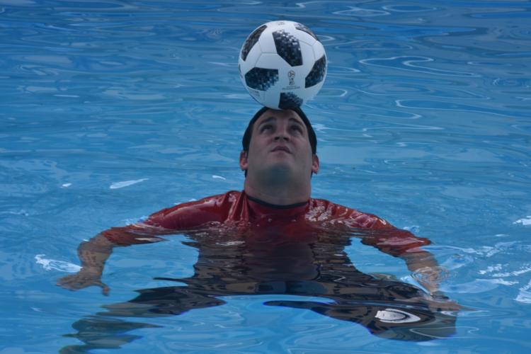 Vestido con su acostumbrado traje rojo y azul, el conocido delfín matancero se ubicó sobre los tres metros de profundidad en la alberca capitalina y puso el balón de fútbol en su cabeza para sostenerlo sin poner sus pies en el fondo, solo flotando con manos y pies. Viento en calma, poco sol y todos los jueces acreditados era el escenario previsto.