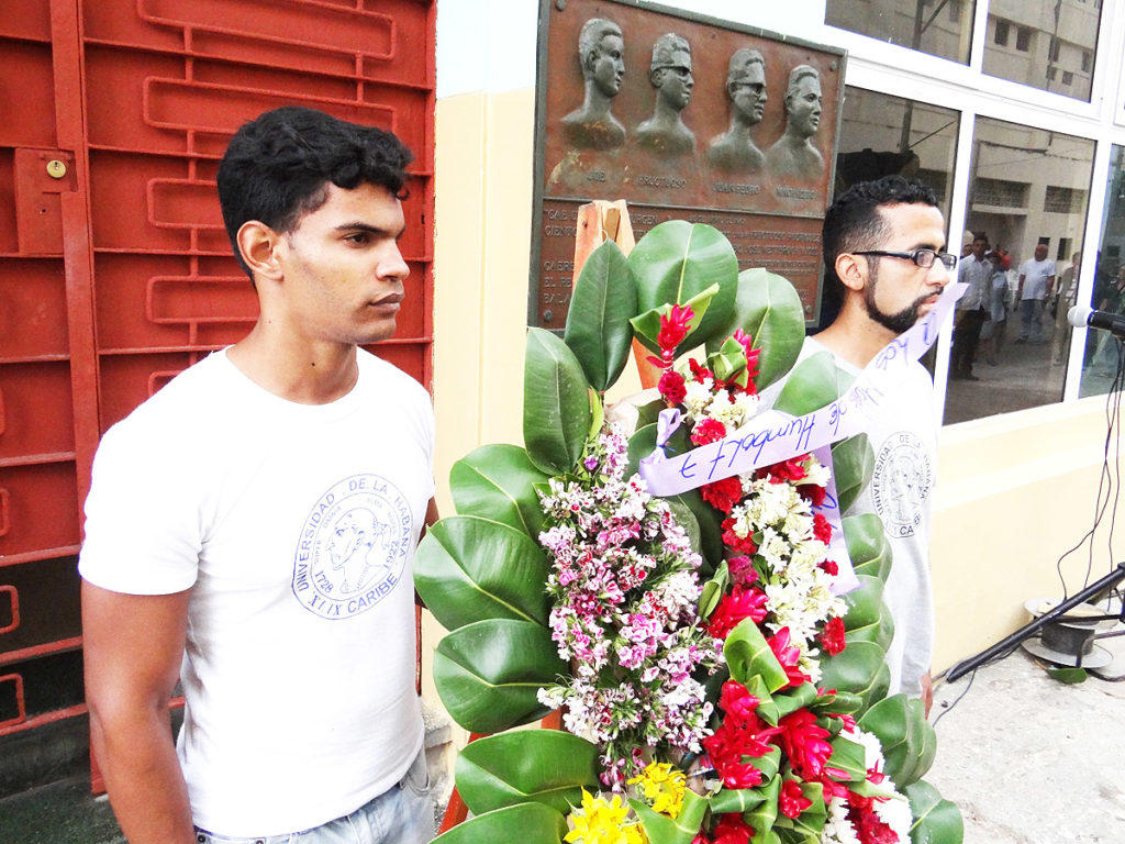 Frente al edificio marcado con el número 7 de la calle Humbolt, en Centro Habana, donde el 20 de abril de 1957 esbirros de la tiranía de Fulgencio Batista asesinaron a Fructuoso Rodríguez, José Machado, Joe Westbrook y Juan Pedro Carbó, estudiantes y jóvenes cubanos se dieron cita para rendirles homenaje.