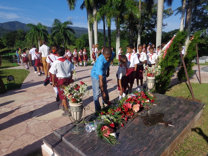 La losa que cubre el sepulcro del fundador del Tercer Frente guerrillero se colmó de flores, depositadas por campesinas, jóvenes, combatientes, niñas, niños… que llegaron hasta allí para recordar al legendario luchador, quien acuñó en Cuba una frase lapidaria: Aquí no se rinde nadie.