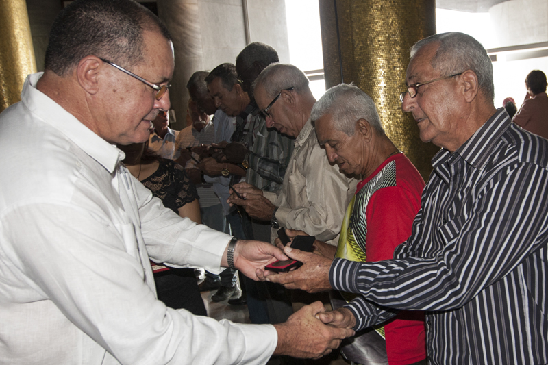 Los 63 condecorados tributaron homenaje a José Martí con la colocación de una ofrenda floral ante su monumento momentos antes de comenzar el acto que estuvo presidido por Nuria Coballes Coba, funcionaria del Comité Central del Partido Comunista de Cuba, Orlando Celso García, presidente del grupo empresarial AZCUBA y Ernesto Freire Casañas, jefe de departamento de la Central de Trabajadores de Cuba.