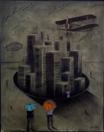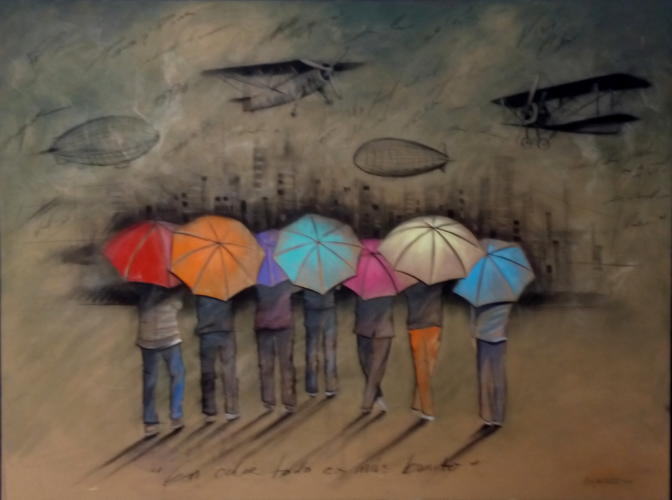Las sombrillas y los paraguas son emblemas milenarios —aludidos por grandes artífices a través de la historia del arte universal—, su representación en el lejano oriente rememora al cielo y a la realeza; y se encuentra entre los ocho símbolos de fortuna del budismo. El paraguas es, además, distintivo de austeridad y estatus, e igualmente simboliza la riqueza. Sobre esos atributos descansa la fuerza conceptual de las tesis pictóricas de Erik, mezcla de imaginación y de realidad que discurre desde su subconsciente para exteriorizarse sobre la tela o la cartulina, en matices ricos en tonalidades frías y cálidas que configuran ambientes de particular belleza expresiva.