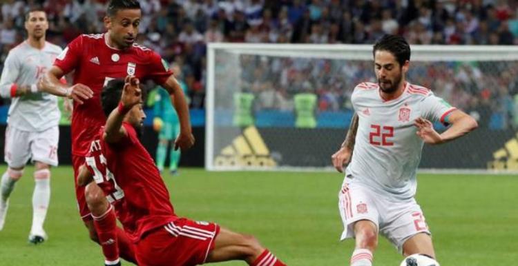 Fernando Hierro modificó la alineación y entraron a jugar Lucas Vázquez por Koke Resurrección y Daniel Carvajal en lugar de Nacho Fernández. En el Kazán Arena con clara mayoría de aficionados iraníes, el primer tiempo tuvo un claro dominio de La Roja en posesión, alrededor del 75%, pero sin lograr penetrar la defensa rival totalmente replegada en su campo, solo cuatro tiros a puerta. Guión lógico, pues los apurados en obtener unidades eran los ibéricos y a Irán el empate le vendría de maravilla.