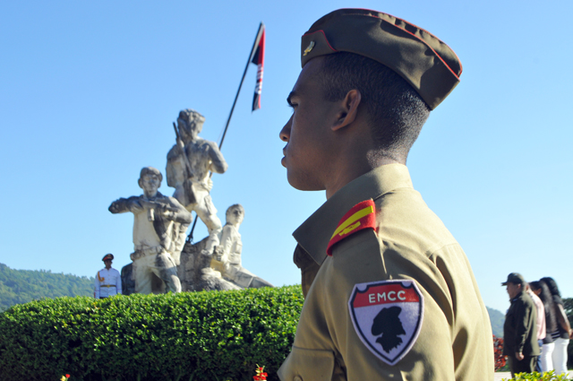 Luego los habitantes de esa serranía marcharon hasta la Loma de la Esperanza, donde la ceremonia militar de guardia de honor estuvo protagonizada por alumnos de la escuela militar Camilo Cienfuegos del municipio de Contramaestre, quienes colocaron ofrendas florales en nombre del General de Ejército y Primer Secretario del Partido Raúl Castro; del Presidente de los Consejos de Estado y de Ministros Miguel Díaz-Canel Bermúdez y otra del pueblo de Cuba.