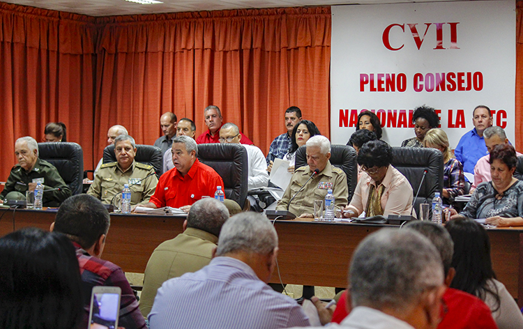 El 107 Pleno del Consejo Nacional de la Central de Trabajadores de Cuba (CTC) sesionó este viernes, presidido por Ulises Guilarte De Nacimiento, secretario general de la CTC y el General de Cuerpo de Ejército Joaquín Quintas Solá, viceministro de las Fuerza Armadas Revolucionarias, así como viceministros de diferentes sectores.