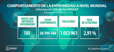 Hasta el 8 de octubre se reportan 185 países con casos de COVID-19, asciende a 36 millones 194 mil 764 los casos confirmados (+ 346 mil 495) y un millón 053 mil 961 fallecidos (+ 5 mil 780) para una letalidad de 2,91 (-0,01).