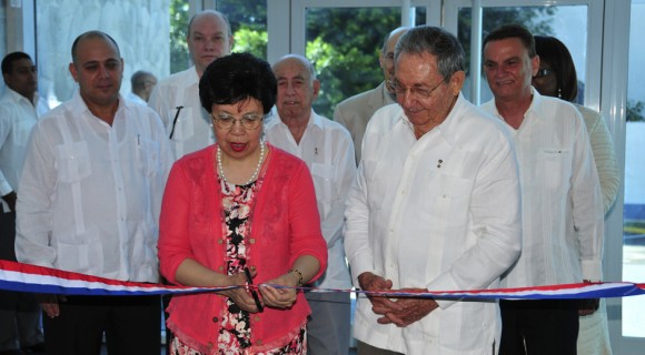 Raúl Castro Ruz, Presidente de los Consejos de Estado y de Ministros de Cuba, Margaret Chan, directora general de la Organización Mundial de la Salud (OMS) y Clarissa Etienne, directora general de la Organización Panamericana de la Salud (OPS) presidieron este martes la ceremonia protocolar de inauguración oficial de la nueva sede del Centro Nacional para el Control Estatal de Medicamentos y Dispositivos Médicos (CECMED) y el Centro Nacional Coordinador de Ensayos Clínicos (CENCEC).