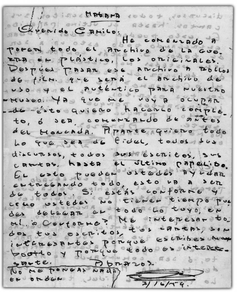 “Después pasar ese archivo a rollos de film, que será el archivo de uso y el auténtico para nuestro museo. Ya que me voy a ocupar de esto quiero hacerlo completo, o sea, comenzando de antes del Moncada. Aparte quiero todo lo que sea de Fidel, todos sus discursos, todos sus escritos, sus cartas, hasta el último papelito.