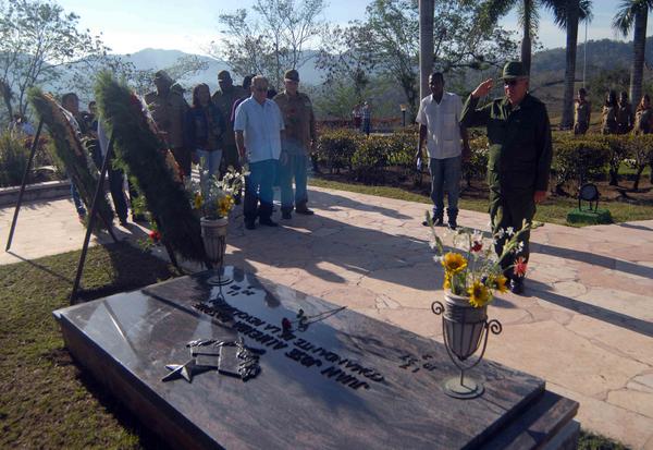 En tan sagrado lugar de la patria, el miembro del Buró Político y viceministro de las FAR, general de cuerpo de ejército Ramón Espinosa Martín, y el integrante del Comité Central, Lázaro Expósito Canto, primer secretario del Partido en la provincia, encabezaron la colocación de flores sobre la lápida a ras de tierra.