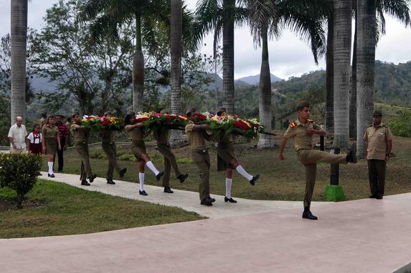 Estudiantes de la Escuela Militar Camilos Cienfuegos del municipio de Contramaestre protagonizaron la guardia de honor, mientras el pueblo serrano colmó nuevamente La Loma de La Esperanza, en el poblado de Cruces de los Baños, para rendir tributo a sus héroes y mártires.