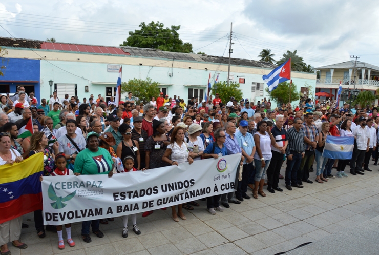 US. Naval Base Guantánamo Bay…bye (adiós a la base naval de Guantánamo) este grito de lucha y de paz, en idioma ingles y en otras lenguas, se escuchó reiteradamente en el heroico poblado de Caimanera, limítrofe con la ilegal instalación militar yanqui, enclavada en la bahía, instalación que es la más antigua de las de su tipo existentes en el mundo, y desde donde, en más de un siglo, se cometieron vejaciones y crímenes que costaron la vida de hijos de Cuba y de otras latitudes.