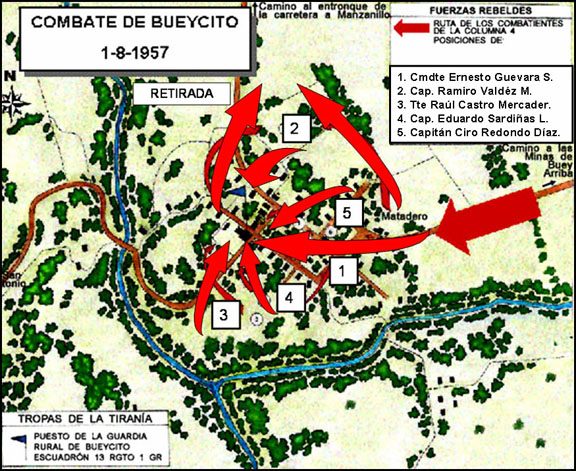 Ya instalado en el lugar, al escuchar por la radio nacional que el 27 de julio había sido atacado el cuartel de Estrada Palma, Che decidió homenajear a los caídos en el Moncada, atacando el de Bueycito.