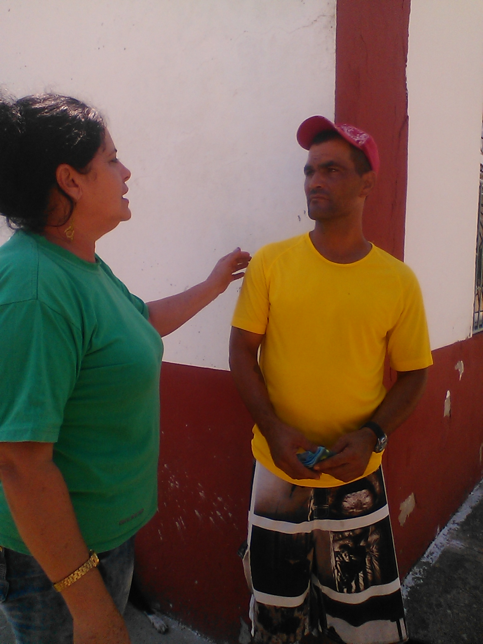 Consuelo Baeza conversa con un obrero damnificado de la tenería de Caibarién, y conoce de las acciones solidarias de su colectivo.