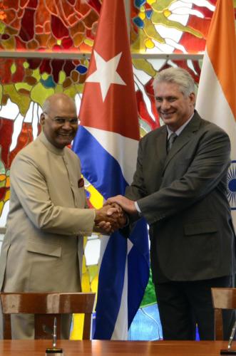 El Presidente de los Consejos de Estado y de Ministros, Miguel Díaz-Canel Bermúdez, recibió en la mañana de este viernes al Presidente de la República de la India, excelentísimo señor Ram Nath Kovind, quien realiza una visita oficial a nuestro país.