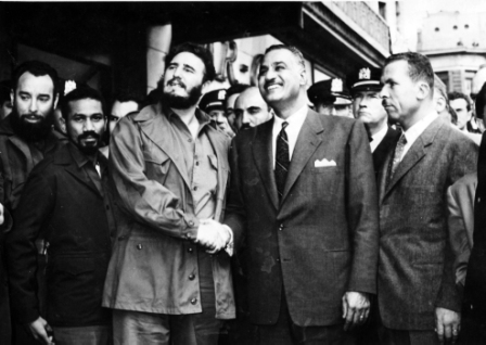 Fidel despide a la entrada del hotel Theresa, en Harlem, a Gammal Abdel Nasser, presidente de la Repùblica Arabe Unida (RAU) con quien sostuvo un fraternal encuentro. Acompañan a Fidel el Comandante Juan Almeida y el Capitan Antonio Nuñez Jimenez.