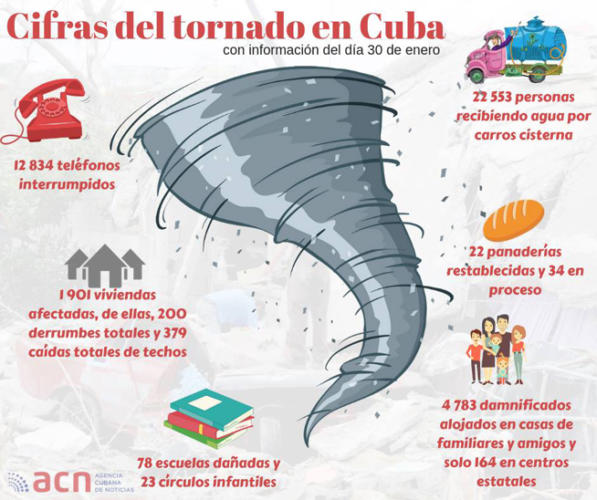 Recordó que a las familias de los municipios azotados por el tornado (Regla, Guanabacoa, San Miguel del Padrón, La Habana del Este y Diez de Octubre) las autoridades locales, incluidas las sanitarias, les han pedido extraer de sus casas o inmuebles los desechos o escombros provocados por los derrumbes, como parte de las necesarias medidas de saneamiento.