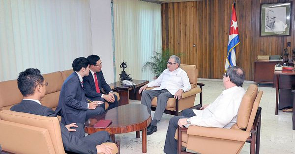 El canciller vietnamita se reunió en distintos momentos con el primer secretario del Comité Central del Partido Comunista de Cuba, Raúl Castro; el Presidente de los Consejos de Estado y de Ministros, Miguel Díaz-Canel Bermúdez; y el presidente de la Asamblea Nacional del Poder Popular (ANPP), Esteban Lazo Hernández.