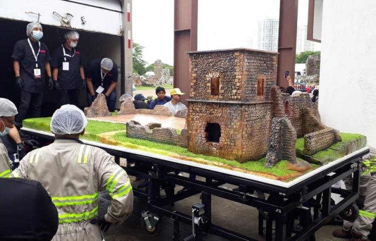Hecho a escala real, el dulce pesa más de dos mil libras y para su confección los maestros reposteros contaron con planos ilustrativos de las ruinas de Panamá Viejo, rellenas de buttercream y manjar, sabores típicos del paladar istmeño.