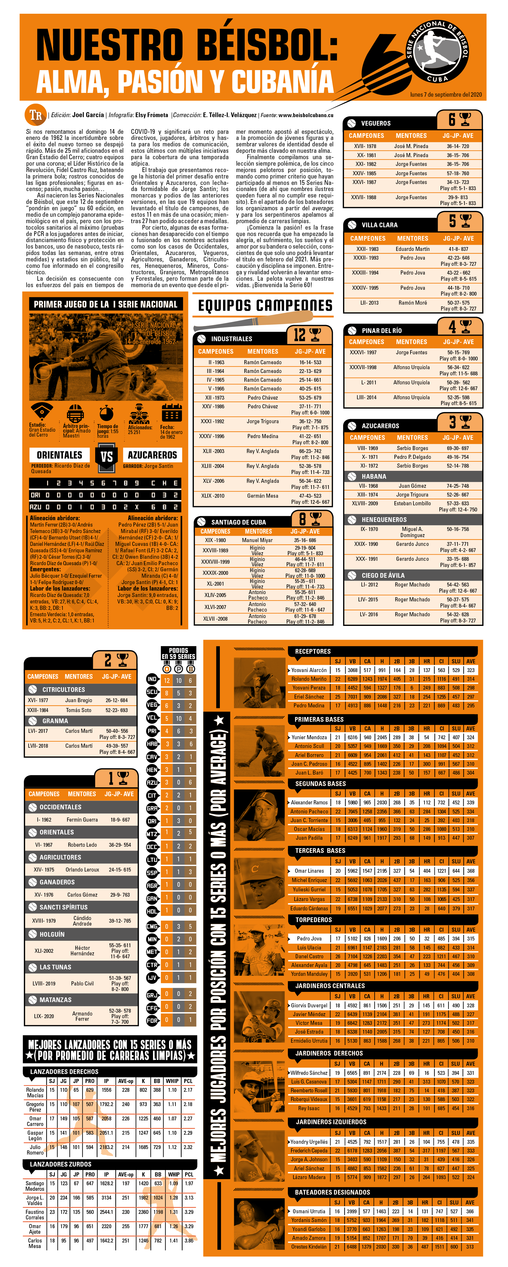 El trabajo que presentamos recoge la historia del primer desafío entre Orientales y Azucareros, con lechada formidable de Jorge Santín; los monarcas y podios de las anteriores versiones, en las que 19 equipos han levantado el título de campeones, de estos 11 en más de una ocasión; mientras 27 han podido acceder a medallas.