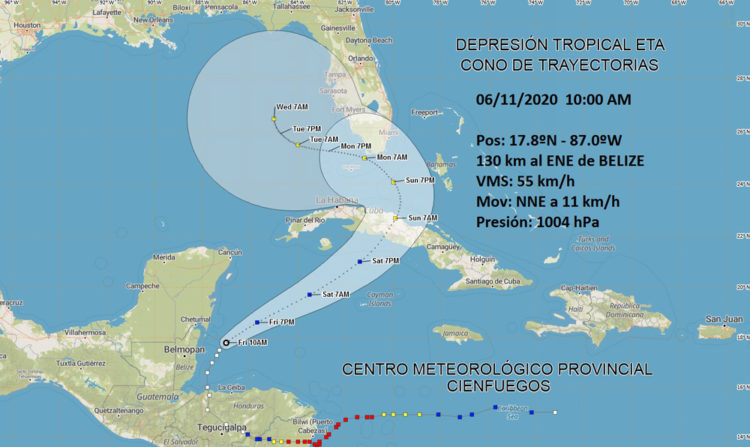 Los meteorólogos aseguran que la actual depresión tropical Eta, que se mueve sobre las aguas del Mar Caribe y tiene posibilidades de convertirse en depresión, puede comenzar a afectar a Cuba el fin de semana.