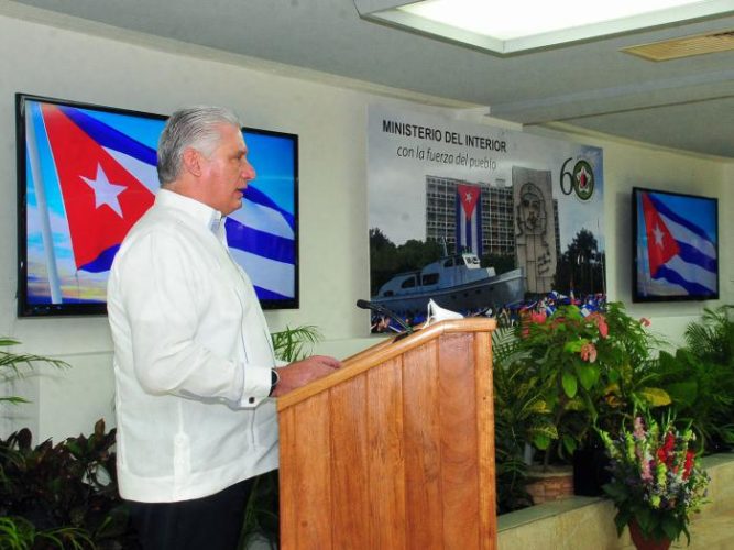 A pocas horas del aniversario 60 del Ministerio del Interior, el General de Ejército Raúl Castro Ruz y el Primer Secretario del Comité Central del Partido Comunista, Miguel Díaz-Canel Bermúdez, encabezaron el acto que conmemoró la constitución oficial, el 6 de junio de 1961, de esa institución que es «baluarte imprescindible de la Revolución Cubana».