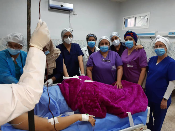 “Solo atendemos a las mujeres; es una tradición musulmana. Los habitantes son muy pobres. El policlínico tiene pocos recursos, aunque consta con servicios de radiografía, maternidad, laboratorio clínico y hemodiálisis. No tiene salón de operaciones, pero sí una sala de observación de Medicina con siete camas, la que atienden médicos argelinos y yemenitas”, explica.