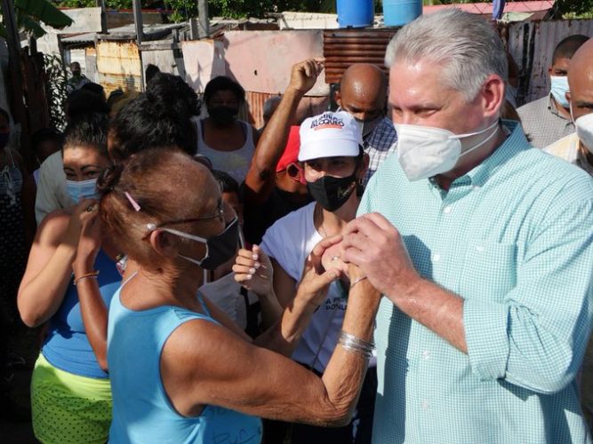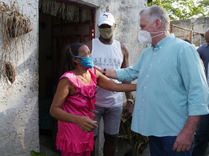 Díaz-Canel también caminó por entre las casas de la barriada, se adentró por pasajes, saludó a todos, y se detuvo especialmente ante cada ama de casa, ante alguna anciana que le pedía se hiciera una foto con la bisnieta de la familia, ante las resistentes mujeres que al paso del Jefe de Estado decían «Ay, Dios mío…», o gritaban vivas a la Revolución y al Presidente que las había ido a ver.