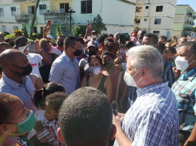 El país atraviesa una situación compleja, pero con el control de la pandemia que hemos logrado gracias a nuestras vacunas, podemos avanzar mejor, de forma más acelerada, decía a los parroquianos de una comunidad de edificios de cuatro plantas a un lado de la calle, modestas casitas al otro, y polvo por doquier, testimonio de la sequía que afecta al sur guantanamero, como históricamente sucede.