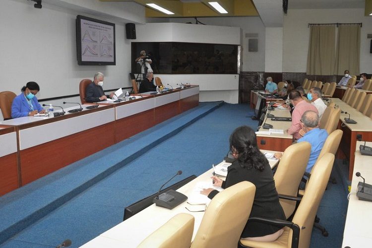 Para abordar estos temas que están directamente relacionados con la salud de los cubanos y la defensa de la vida, tuvo lugar antes, también desde el Palacio de la Revolución, la habitual reunión de expertos y científicos que están inmersos en las actividades de ciencia e innovación tecnológica para el enfrentamiento al nuevo coronavirus.