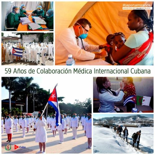 En el 59 aniversario de la colaboración médica internacional cubana, nuestro reconocimiento a los colaboradores de la #salud de #Cuba, cuya labor humanista y altruista seguirá poniendo en alto los principios solidarios de la #Revolución y el legado de #Fidel.#CubaPorLaVida🇨🇺 pic.twitter.com/qqdXXXYYEW