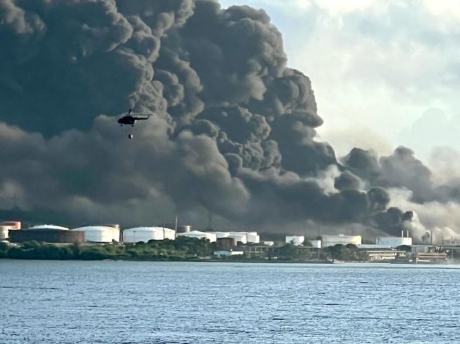 La densa y potente nube de humo, generada por el incendio en la Base de Supertanqueros de la bahía de Matanzas, está desplazándose desde la madrugada por el noroeste de esa provincia, y la porción norte de Mayabeque y La Habana, informó MeteoAlerta, a través de canal de Telegram.