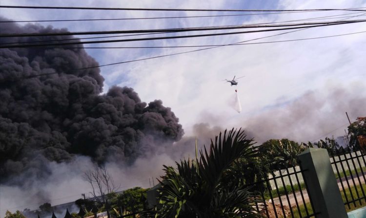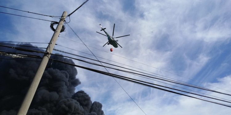Helicópteros de las Fuerzas Armadas se mantienen vertiendo agua de la bahía sobre el incendio en Matanzas.