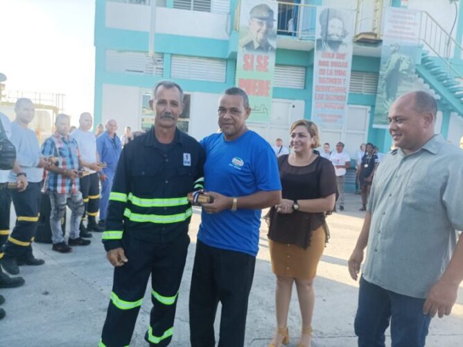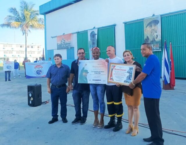 Premiado por su labor en la recuperación de las afectaciones causadas en Pinar del Río por evento meteorológico Idalia, el contingente Antonio Guiteras Holmes, de la Empresa Eléctrica, recibió su distinción de manos de Susely Morfa González, miembro del Comité Central del Partido y su primera secretaria en territorio yumurino, del gobernador Mario Sabines Lorenzo, y de Osmar Ramírez Ramírez, secretario general del Comité Provincial de la Central de Trabajadores de Cuba (CTC)
