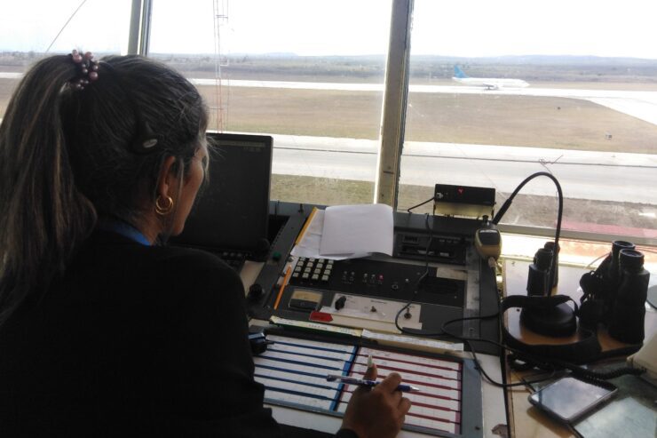 Son pocos, pero casi ni hablan entre ellos. Cada sentido lo tienen ocupado en alguna acción: anotan, hablan por teléfono o por diferentes vías en inglés técnico o con unos binoculares escudriñan el horizonte constantemente. De noche o de día, mientras haya vuelos, los muchachos de la torre de control del aeropuerto internacional Ignacio Agramonte, de Camagüey, están siempre alertas.