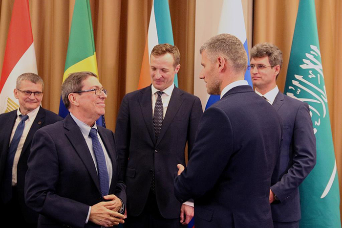 Al titular de Relaciones Exteriores de la mayor de las Antillas lo acompañan el embajador de Cuba en Rusia, Julio Garmendía, el jefe de la Secretaría del canciller, Nelson Tamayo, la especialista superior de la Dirección de Europa y Canadá, Mercedes Martínez y la especialista de la Dirección de Asuntos Políticos Multilaterales Nadiezda Arredondo.