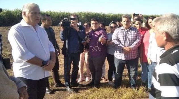 Acompañado de Roberto Morales Ojeda, miembro del Buró Político y secretario de Organización del Comité Central del Partido Comunista de Cuba, el jefe de Estado inició su agenda en un intercambio con el productor Luis Alberto Pérez, a la orilla de unos de sus vigorosos sembrados de caña.