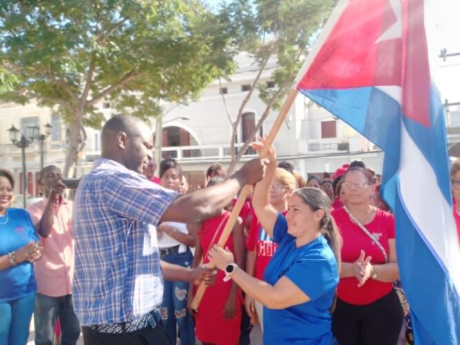 En la Placita de los Mártires, sitio vinculado a los protagonistas de la gesta del 30 de Noviembre de 1956, el secretario general de la CTC en la provincia, Orlando Beltrán Minier hizo entrega de la enseña nacional a Emildriadis Domínguez, máxima representante de la organización proletaria en el municipio cabecera de la provincia.