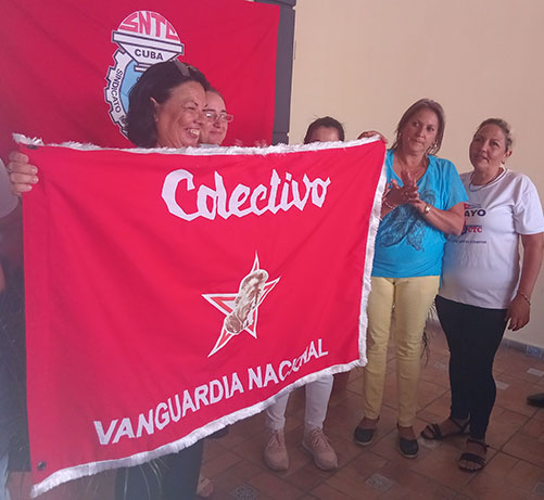En representación del colectivo recibieron la bandera con la efigie de Lázaro Peña, la secretaria general del Buró Sindical y el gerente general de la entidad, Soraya García Cabrera e Iván Paz Pérez de Corcho, respectivamente.