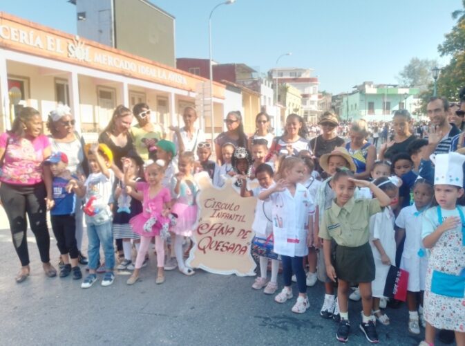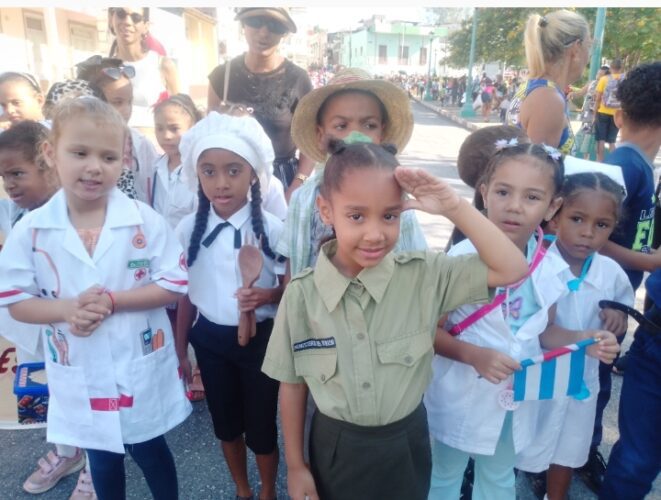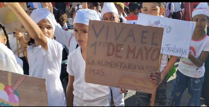 Ataviados como trabajadores de diferentes sindicatos, representando profesiones u oficios, los infantes marcharon por la céntrica plaza de Marte, tal cual lo hacen sus padres, en bloque apretado, alzando banderas cubanas, con carteles y pancartas, entre vítores de «Viva el Primero de Mayo» y «Por Cuba Juntos Creamos».