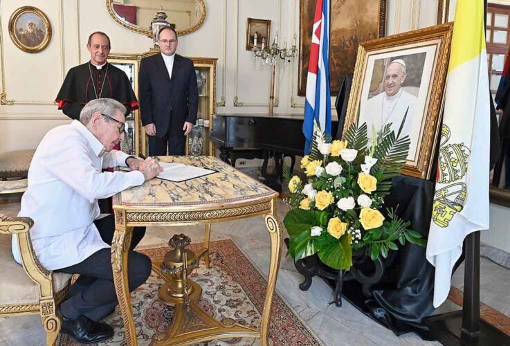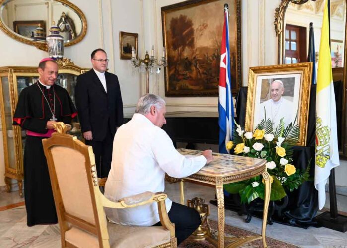 El general de Ejército Raúl Castro y el presidente de Cuba, Miguel Díaz-Canel, firmaron hoy el libro de condolencias abierto en la Nunciatura Apostólica en esta capital por la muerte del papa Francisco.