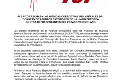 La Alianza Bolivariana para los Pueblos de Nuestra América –Tratado de Comercio de los Pueblos (ALBA –TCP) rechazó el martes el anuncio de nuevas sanciones contra funcionarios del gobierno de Venezuela por parte del Consejo de Asuntos Exteriores de la Unión Europea. Continuar leyendo