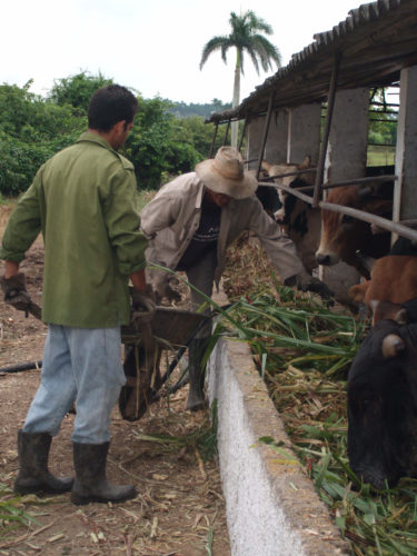Casi de inmediato trajeron una maquina forrajera criolla y luego otra de fabricación coreana; también las cinco libras de proteínas (North Gold) que debe recibir cada animal. La UBPC, a la que está adscrita la finca, cedió las pequeñas zonas donde a la combinada se le dificultaba cortar, los trabajadores se desplazaban hacia esos lugares cortaban y traían la caña con tracción animal.
