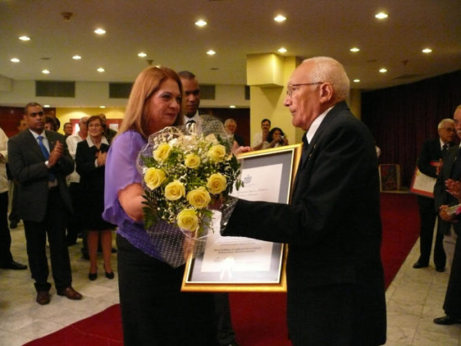 Vitervo O´relly, Héroe del Trabajo de la República de Cuba durante la entrega del título Doctor Honoris causa del ISPJAE. Entrega el título la compañera Alicia Alonso, Rectora del ISPJAE. Foto: Yoandry Aguilar