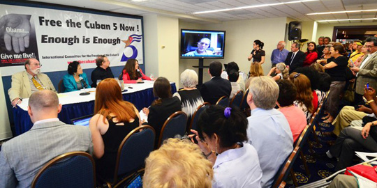 La sala del histórico Club Nacional de la Prensa en Washington resultó pequeña para la cantidad de asistentes que se dieron cita este viernes a las 9.00 am para escuchar por primera vez a René González, uno de los cinco patriotas cubanos, quien desde La Habana participó en la Conferencia a través de internet, con el periodista y escritor español Ignacio Ramonet; Dolores Huerta legendaria dirigente por los derechos de los inmigrantes, cofundadora del Sindicato de los Trabajadores del campo y a quien Obama condecoró en 2012 con la medalla de la Libertad; Wayne Smith ex jefe de la Sección de Intereses de EEUU en La Habana durante la presidencia de Carter y Alicia Jrapko coordinadora en Estados Unidos del Comité Internacional por la Libertad de los Cinco.