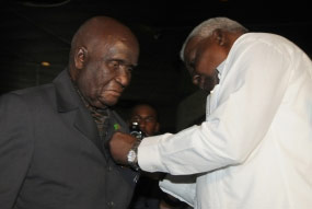El expresidente de Zambia Kenneth Kaunda recibió este martes la Orden de la Solidaridad, conferida por el Consejo de Estado de Cuba, de manos del presidente de la Asamblea Nacional del Poder Popular, Esteban Lazo.