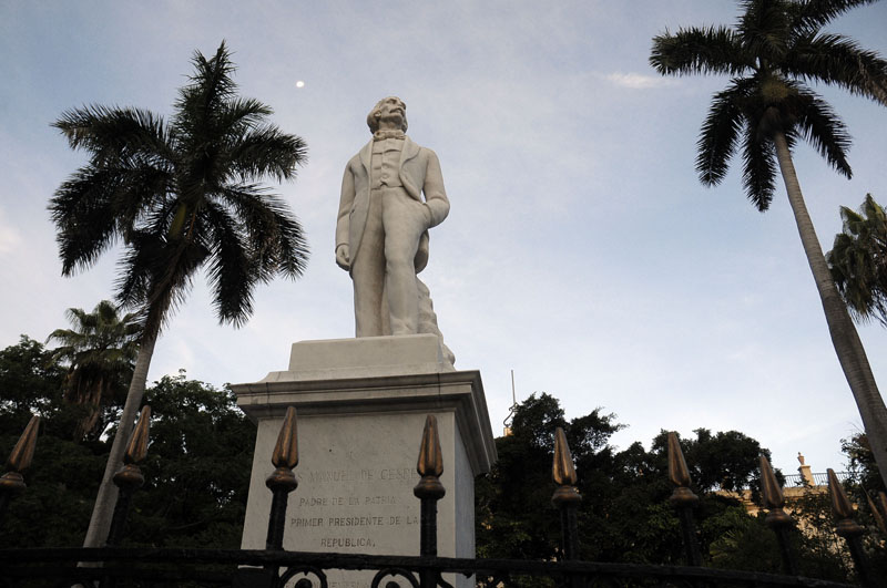 En el centro de la cuatricentenaria Plaza de Armas y frente al Templete, lugar fundacional de la Ciudad de La Habana, se levanta la estatua a Carlos Manuel de Céspedes, el Padre de la Patria, primer presidente de la República en armas. El 27 de febrero de 1955, al cumplirse ochenta y un años de la caída en combate del patriota cubano, se desplazó la estatua del rey español y se inauguró la del Padre de la Patria, cuya figura en mármol blanco de Carrara, aparece de pie, con la indumentaria de la época, la cabeza descubierta y una altura de 5, 58 metros. Céspedes nació en Bayamo en 1819 y el 10 de octubre de 1868 se levantó en armas contra el colonialismo español.