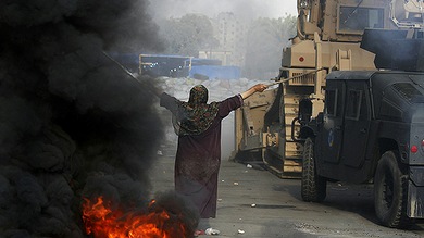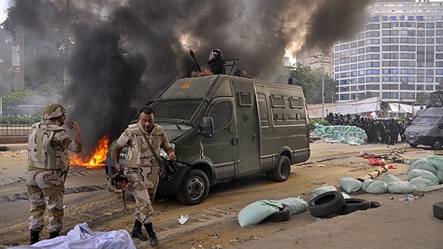 Numerosos helicópteros sobrevuelan el centro de El Cairo llamando a los manifestantes a dispersarse a través de megáfonos. Paralelamente, buldózeres ‘entierran’ las partes evacuadas de los campamentos. Los manifestantes, por su parte, queman neumáticos para bloquear a las fuerzas de seguridad.