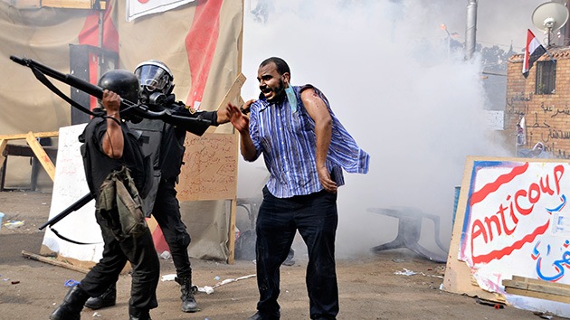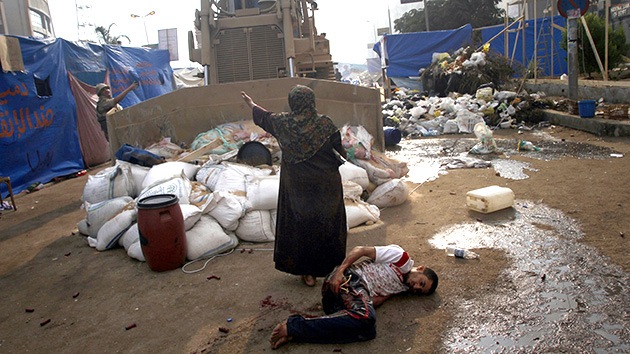 Numerosos helicópteros sobrevuelan el centro de El Cairo llamando a los manifestantes a dispersarse a través de megáfonos. Paralelamente, buldózeres ‘entierran’ las partes evacuadas de los campamentos. Los manifestantes, por su parte, queman neumáticos para bloquear a las fuerzas de seguridad.