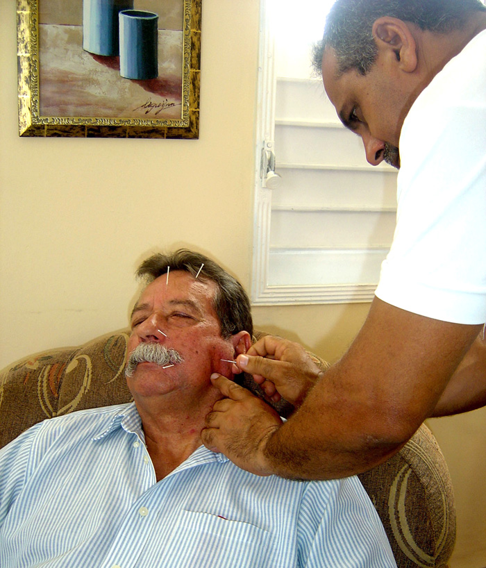 Agujas en mano estaba en la consulta, José Cintra Rodríguez, especialista de segundo grado en MNT. “Este paciente tiene una parálisis facial periférica de Bell y le aplicamos tratamientos con acupuntura, masaje tuina y farmacopuntura”. “Estoy contento, pues he notado mejoría”, afirmó Reinaldo Sosa Méndez.