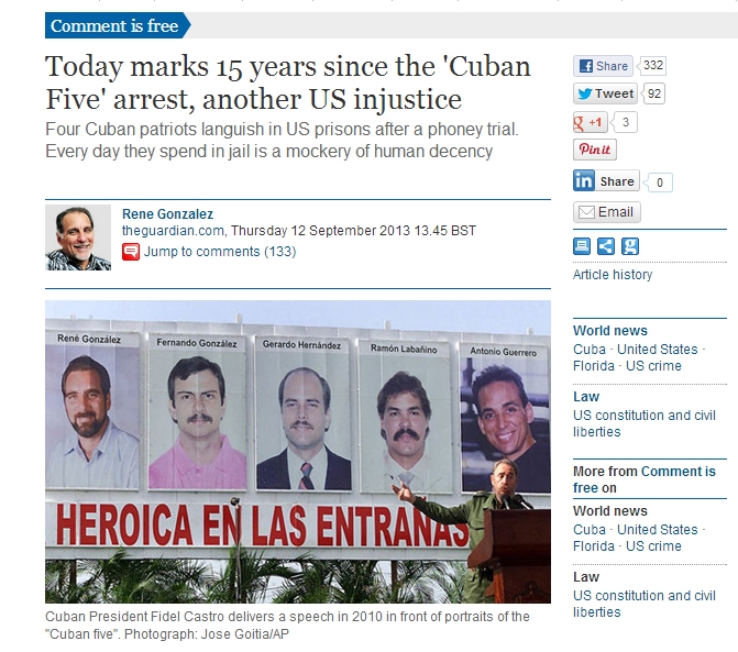 René González es un tipo incombustible. No solo lanzó la más auténtica de las campañas que se han realizado por el regreso de Los Cinco, no solo está en cuanto evento se hace en reclamo de la liberación de sus compañeros, no solo grita al mundo que el está preso aun con sus hermanos. El pasado 12 de septiembre, día en que se cumplieron 15 años del encierro de Los Cinco y Cuba fue invadida por el amarillo, René publicó un comentario en el prestigioso The Guardian, un comentario que ha generado cientos de opiniones, y ha tenido una amplia difusión entre los usuarios de las redes sociales. Y nosotros, despistados, ni nos habíamos enterado por acá. Y él sin decir una sola palabra al respecto. Es admirable lo de René, no solo es un tipo incombustible. También es modesto.