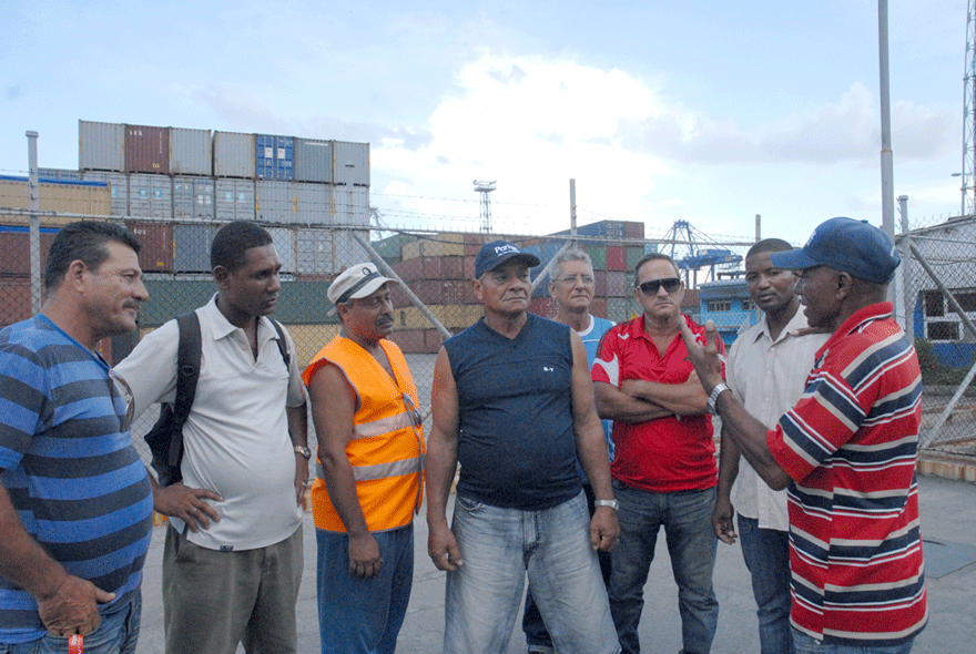 “Traemos el sentir de nuestro colectivo. Mire, en agosto el descuento llegó al 38 %, todo un récord. De cada 100 ya ganados, nos descontaron 38 CUC”. En la foto integrantes del buró sindical de la Terminal de Contenedores de La Habana. Foto: Agustín Borrego